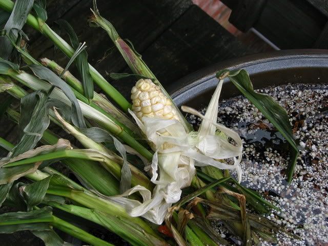 mark's been growing deckcorn since before i moved home. yup, corn in a huge bucket out on his and adam's deck (or balcony, actually). god, i love how crazy mark is. i don't know anyone else who would attempt such a feat - the bucket takes up a third of their tiny deck!! the corn's been a little neglected lately and only one ear survived. but damn, check out the size of those kernels!!!! i can't wait until next year's batch of deckcorn. yum!