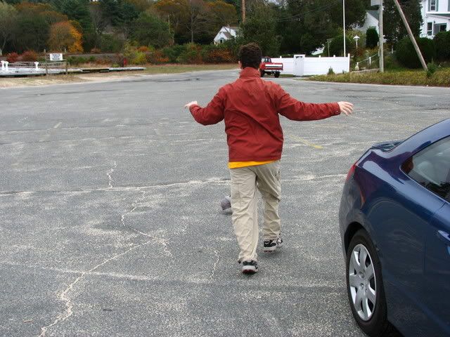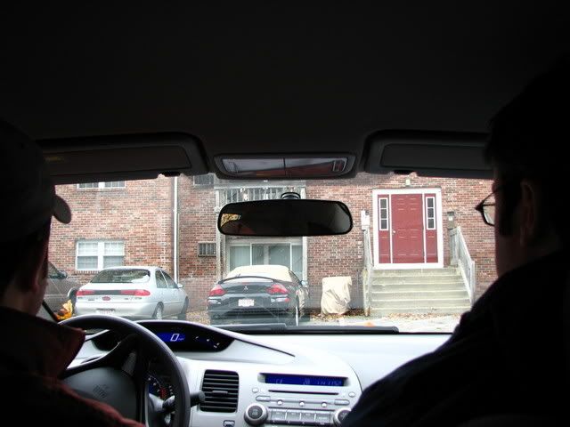 anyway, i visited mark and adam friday night. this is adam clutching a box of rolling rock in the resident parking lot in front of his new civic (which, unfortunately, isn't very visible here). adam didn't know that i had gotten a new civic a week after him and he was quite surprised to see it in visitor parking. we walked back and forth between visitor parking and resident parking comparing the 08 civic coupe (his) to the 08 sedan (mine, duh) and talking about how much we believe in our new rides. "civic!" was mantra-ized out there in the cold. good times.