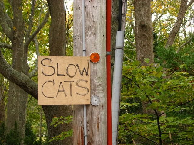 so we saw this sign while driving back to their crib. adam pointed it out and told me it meant that there were retarded cats in the area. i can't believe i fell for that all the way up until he explained that it really probably meant to "slow down, y'all, there be cats up in this piece." gullible's written on the ceiling of his civic, by the way.