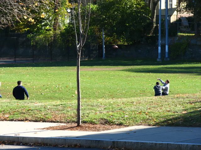i had to park on the street and ended up doing so right next to a field where like 12 dudes were playing football. at first i was excited because i'm dying to get some more sports action shots after that awesome time at the mets game. i have this pipe-dream of becoming a sports photographer someday. but i wussed out because i imagined the dudes would be a little perturbed to see some random nerdy looking fella taking pictures of them. i did take this photo from across the street and if you look closely, you can see the football in the air. but man, this is nowhere near what i wanted to capture. :(